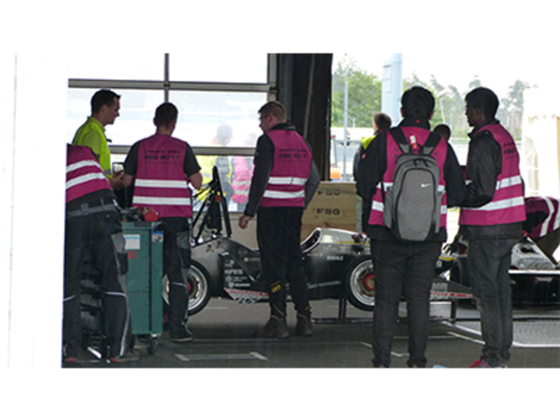 Leider erschienen immer mehr Probleme, sodass sich der Prozess der Abnahme immer weiter hinzog. Alle Teammitglieder standen gemeinsam vor dem Eingang zum Scrutineering und blickten mit hoffnungsvollen Gesichtern zu unserer Dynamic Crew, die gemeinsam mit „edgar“ bei den Scrutineers standen.