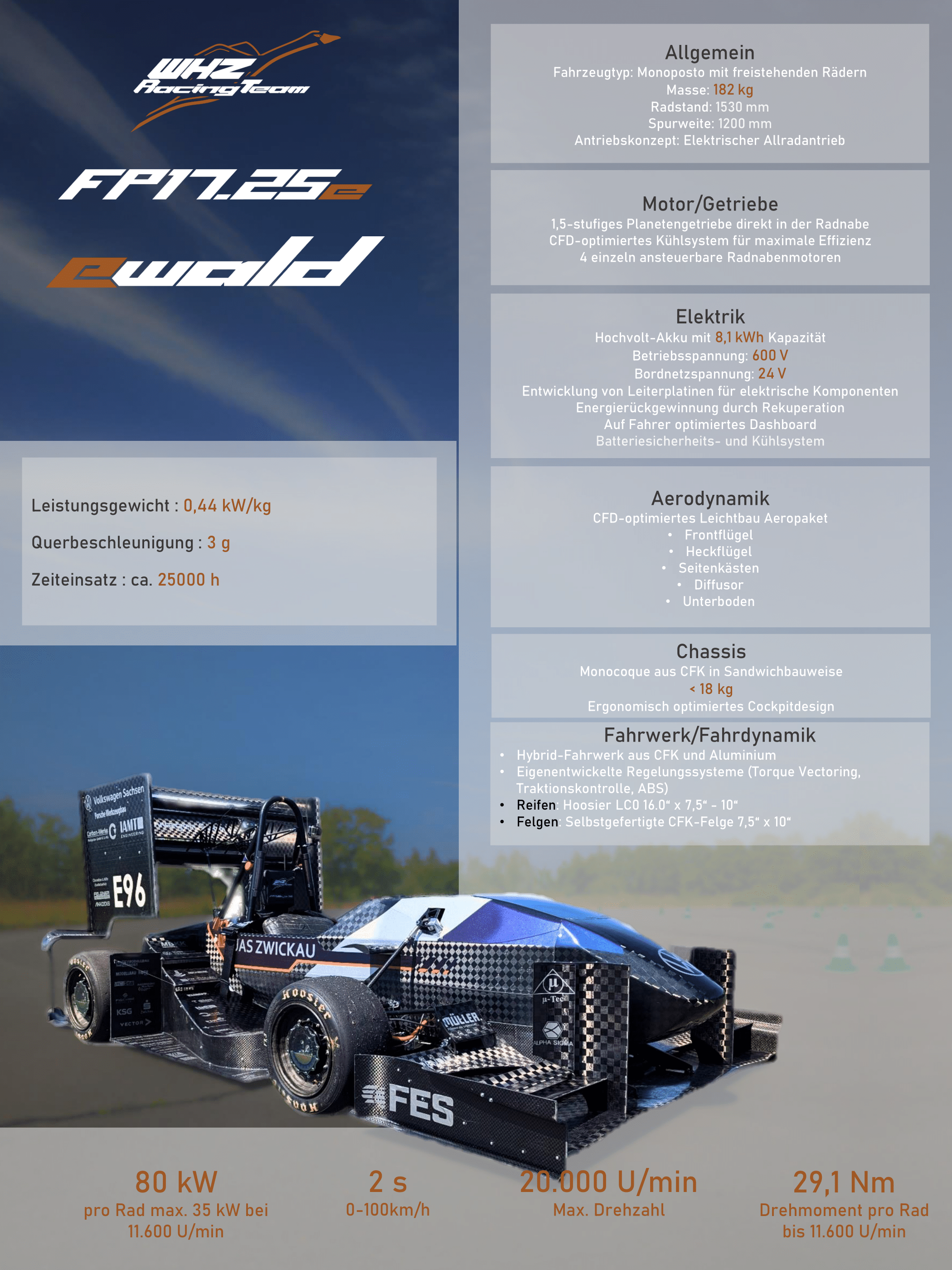 - HV Spannung 600 V- Bordnetz 24 V- Batteriekapazität von 8,1 kWh- Selbstentwickelte Leiterplatinen für elektrische Systeme und Komponenten- Energierückgewinnung durch Rekuperation- Auf Fahrerwünsche angepasstes Informationssystem- Integriertes Batteriesicherheits- und Kühlsystem
